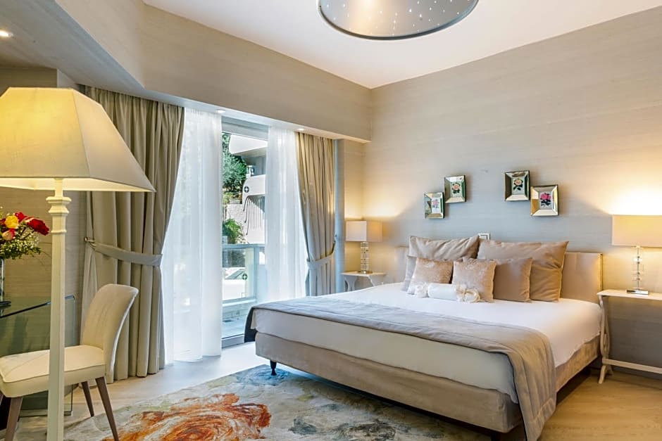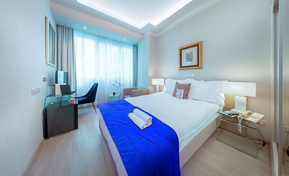 BOUTIQUE ROOM WITH PRIVATE BALCONY ACROPOLIS VIEW is 172 square feet and includes either 2 single beds 80-130 width or a king-size bed 150-183 width plus balcony, desk, satellite tv , hairdryer, tea and coffee making facilities , ironing set, safe, bathrobes, and slippers.